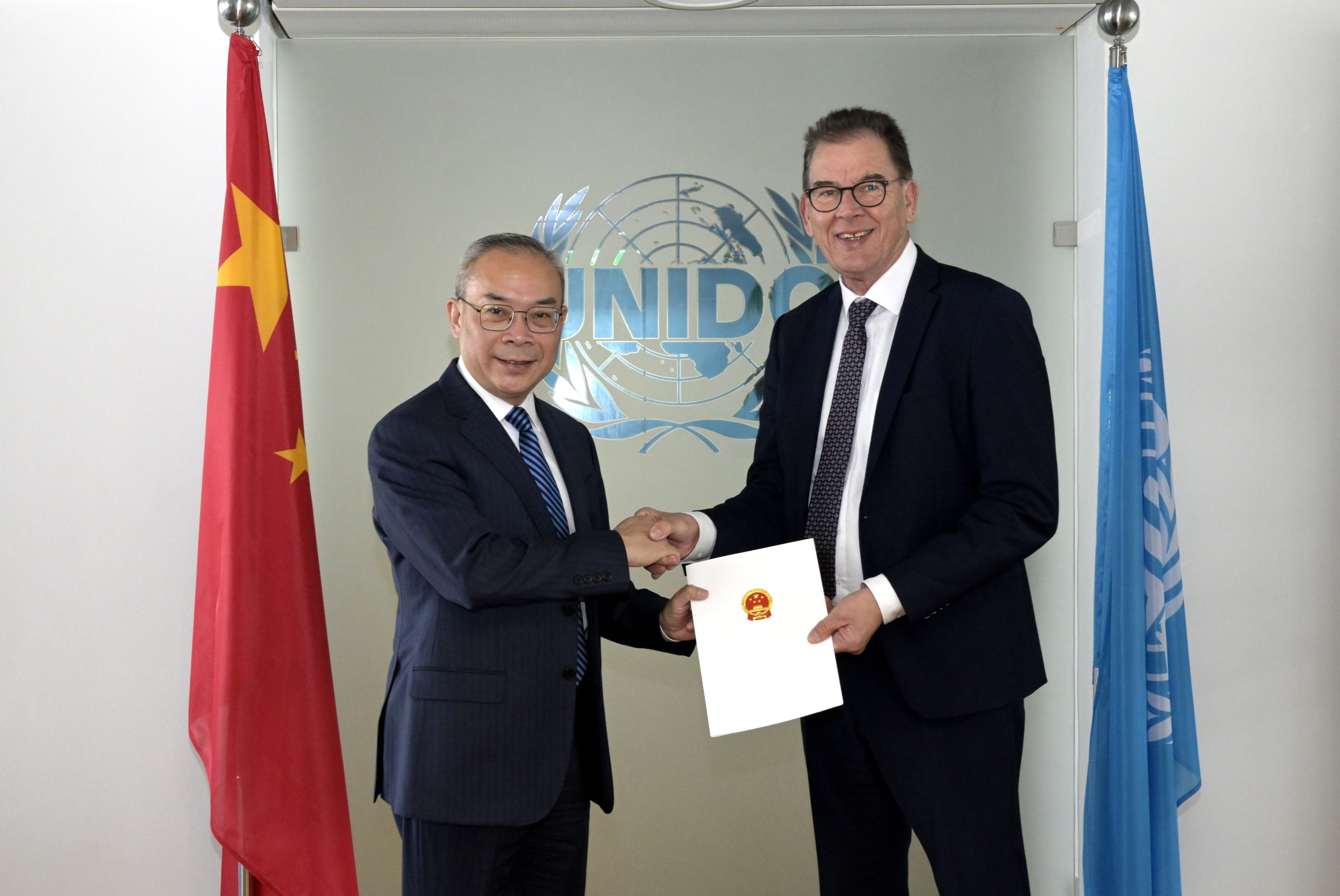 2月28日,中国新任常驻维也纳联合国和其他国际组织代表兼常驻联合国工业发展组织(下称“工发组织”)代表李松大使在维也纳工发组织总部向总干事穆勒递交了全权证书,并同穆勒进行了会谈。